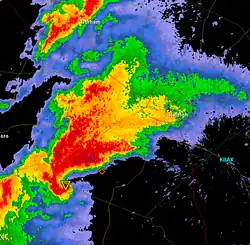 ![]() The Raleigh supercell as it is about to enter the city. The upside-down triangle icon is a tornado vortex signature marker. | |