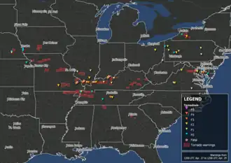 ![]() Tornado warnings and confirmed tornadoes on April 27–28 | |