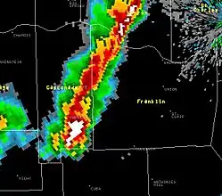 Another storm moving across the Ohio River and into Louisville, Kentucky spawned a tornado that damaged several houses before dissipating. As the supercell thunderstorm crossed over Louisville, National Weather Service NEXRAD doppler capability detected rotation at the mid-levels of the thunderstorm as it crossed the city producing hail and heavy rain.[27] In Adair County, two tornadoes were reported. One was an F2 tornado which touched down south of Columbia destroying a mobile home and damaging several houses. Another tornado, an F1 touched down near Pellytown causing damage to several homes.[28] In Lincoln County, another thunderstorm spawned a tornado that touched down 3 miles south of McKinney and moved northeast peaking at F2 strength before dissipating. The tornado damaged or destroyed several mobile homes and injured two people person.[29][30] Damage from the tornado amounted to $350,000 (2006 USD).[30]