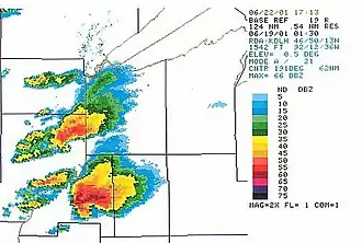 After a brief F0 tornado touched down in Florida, meteorological conditions during the evening hours of June 18, 2001 rapidly began to deteriorate across the Upper Midwest. At 7 PM CDT (0000 UTC) an occluding cyclone was present over Northeast Minnesota, while a secondary front was located to its south.[2] A zonally oriented warm front extended from the southern low, while a north–south cold front was located near the low pressure.[2] Cape values in Iowa were between the 3000 to 4500 J/kg range, and conditions were starting to deteriorate there as well.[3] By early evening a line of thunderstorms began to develop along the cold front across Eastern Nebraska and Iowa, and extended up into Minnesota.[3] The first tornado of the outbreak happened at 7:22 PM CDT (0022) near the town of Day, Minnesota. The tornado was rated an F1, and cut a path 8 miles (12.9 km) long through mostly rural areas.[4] At 7:36 PM CDT (0036 UTC) the second tornado of the outbreak, an F0, made a brief touchdown near Tekamah, Nebraska.[5] Some of the Iowa storms also rapidly developed into severe thunderstorms. At 7:59 PM CDT (0059 UTC) Harrison County fire and rescue reported that a tornado had touchdown near Modale.[6] The F0 was on the ground only briefly before lifting.[6] In Wisconsin, convection with was firing up near the Minnesota state border, and an "Enhanced-V" signature became evident on one cell.[7] At 8:06 PM CDT (0106 UTC) an F3 touched down East-Northeast of Grantsburg.[8] The tornado continued in an eastward direction moving through the towns of Alpha, Falun and Siren.[7][8] The tornado moved into Washburn County, where it eventually dissipated near Spooner.[9] The last tornado of the outbreak occurred near Glidden, Iowa. It was rated an F0.[3] Many other storms also caused hail and wind reports across the Midwest, in association with this outbreak.[1]