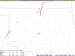 Towards the end of May, 46 tornadoes touched down in an intense two-day outbreak across the Great Plains and Arkansas. On May 25, a large, long-tracked, 1100-yard wide F4 tornado passed west of Aberdeen, Texas before moving into Oklahoma, turning northeast and striking the north side of Sweetwater, killing two and injuring 18. Later, a large, .25 mile wide F3 tornado hit Deer Creek, Oklahoma, injuring one. Soon afterwards, the most violent tornadoes of the year occurred as two large F5 tornadoes touched down within 34 minutes of each other. The first F5 tornado was 500 yards wide and struck the towns of Blackwell, Oklahoma and South Haven, Kansas, killing 20 and injuring 280 on its 28.4 mile path. After that, an even larger, longer-tracked, and deadlier F5 tornado touched down near Peckham, Oklahoma and moved into Kansas. It grew to 1320 yards wide and hit the towns of Ashton, Oxford, Udall, Rock, and Atlanta, killing 80 and injuring 273 along its 56.4 mile path. The 100 deaths accounted for about 77.5% of the fatalities in 1955.[1]