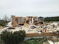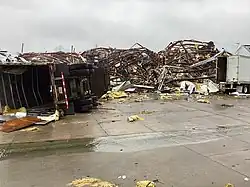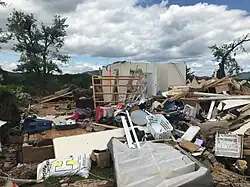 The SPC issued an enhanced-risk outlook, including parts of southern and western Nebraska, northern Kansas, and extreme northeastern Colorado on June 7.[95] Tornadic activity began with an EF1 tornado northwest of Van Tassel, Wyoming, which damaged fences and farm buildings and produced a measured wind gust of 78 mph (126 km/h).[79][96] Several weak tornadoes also touched down in southern Nebraska and northern Kansas on the night of June 7, including an EF1 tornado that downed trees and damaged a grain bin in Narka, Kansas.[97][98][99] Continuing past midnight into June 8, the storm complex produced four tornadoes in or near the Kansas City metropolitan area, including an EF1 tornado that moved through Lenexa and Overland Park, Kansas, before crossing into Missouri and dissipating near Grandview. Structures sustained roof and window damage along its path, and trees and light poles were knocked down. An EF2 tornado near Buckner, Missouri, heavily damaged a metal building, tore a large section of roof off a house, and snapped or uprooted trees.[100] More tornadoes hit Indiana and Ohio on the afternoon and evening of June 8.[101][102] An EF2 tornado severely damaged a Meijer distribution warehouse, flipped cars and semi-trailers, and damaged trees and roofs in Tipp City, Ohio.[103] Another strong EF2 tornado formed near Adelphi, Ohio, and caused major tree damage as it passed through the Hocking Hills region near South Bloomingville, deforesting hillsides as it snapped and uprooted numerous large trees. An EF1 tornado downed numerous trees in and around Springfield, and caused minor damage to homes and outbuildings. EF0 tornadoes caused minor damage in the towns of Sardinia, Ohio, and Summitville, Indiana, as well. Farther east, a brief tornado caused EF0 damage near Mechanicsville, Maryland. On June 9, two final weak tornadoes occurred along the East Coast, including an EF1 tornado damaged trees, homes, a fence, and a shed near Blackwood, New Jersey. Farther south, the other tornado produced EF0 damage to trees and structures in Port St. Lucie, Florida. A total of 30 tornadoes were confirmed.[104] The storm also led to severe flooding in the Birmingham, Alabama metropolitan area on June 8, forcing over 40 people to be rescued.[105] The total system caused $1.8 billion in damage.[106]