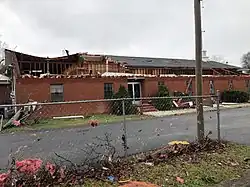 A small outbreak of mostly weak tornadoes impacted the Southeastern United States starting with 13 confirmed tornadoes on New Year's Day. One strong tornado, rated EF2, moved through Hopkinsville, Kentucky, damaging several businesses, homes, warehouses, a church, and a gas station.[16][17] A weak EF0 tornado embedded within larger area straight-line winds also caused minor damage in Bowling Green, an area previously impacted by two strong tornadoes during the previous month, which killed 16 people and injured 63 others.[18][19] An EF1 tornado damaged a few homes, destroyed barns, downed trees, and knocked over gravestones at a cemetery in the Hiseville, Kentucky area. Another brief EF1 tornado caused damage to a few metal buildings and garages at the east edge Lebanon, Kentucky. Near Hazel Green, Alabama, a high-end EF0 tornado damaged several businesses, snapped tree branches, and ripped the roof off a mobile home. One person was injured, the only injury of the outbreak.[20] Three weak, brief EF0 tornadoes touched down in Georgia and Florida on January 2. Two weak tornadoes also touched down in North Carolina during the morning hours of January 3 before the outbreak ended, one of which caused EF1 damage to some hog barns near Newton Grove. In all, 19 tornadoes touched down, with only one injury reported.