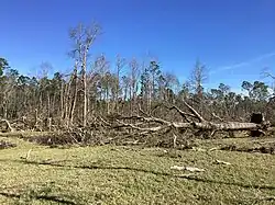On the evening of January 8, a few weak tornadoes touched down in the area in Southeast Texas, including within the Greater Houston area, the strongest of which was an EF1 tornado that caused moderate damage to an office building and some homes near Hedwig Village. An EF0 tornado caused minor tree and structural damage near George Bush Intercontinental Airport, and another EF0 tornado also caused minor damage to a restaurant and a few other buildings in Montgomery. The following day, two EF1 tornadoes caused damage to homes, businesses, trees, vehicles, and a post office in the Humble, Texas area. Later that day, a strong EF2 tornado struck the community of Peason, Louisiana, impacting at least 30 homes and injuring six people, some critically. One mobile home was completely destroyed and swept away by the tornado, and many trees were snapped or uprooted along the path. Near Hornbeck, an EF1 tornado downed trees and caused shingle damage to a home. Two EF0 tornadoes and one EF1 tornado caused minor damage in southern Alabama as well.[21] Overall, 11 tornadoes were confirmed.