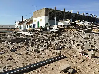 As Storm Nuria made landfall in Iberia, at least three tornadoes touched down in the province of Huelva.[94] An IF1 tornado was confirmed in San Bartolomé de la Torre, collapsing a greenhouse and injuring four workers. Another IF1 tornado struck Moguer, damaging crops and trees. A strong IF2 tornado struck the town of Coria del Río, collapsing an agricultural warehouse and killing three workers.[13]