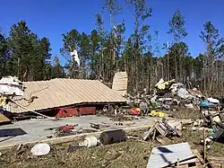 A second, more potent storm system impacted the southeast on February 12, bringing severe thunderstorms and a risk of tornadoes.[26][27] That evening, a few tornadoes touched down in Mississippi and Alabama, including two strong tornadoes. In Mississippi, a high-end EF0 tornado moved through the east side of Columbia, heavily damaging a hardware store, destroying a few sheds, and damaging the roofs of homes in town. A supercell in Wayne County produced a powerful multiple-vortex EF3 tornado that touched down in a rural area to the east of Laurel before it tracked to the northeast near Whistler and dissipated near Matherville, prompting a PDS tornado warning.[28][29] The tornado inflicted major structural damage to a few frame homes, and several mobile homes were completely swept away and obliterated, with their metal frames and debris strewn hundreds of yards across fields. Wooded areas suffered total deforestation, including large trees that were snapped, stripped of their branches, and sustained partial debarking. Some ground scouring also occurred, while a pickup truck, pieces of farming equipment, and RVs were thrown and destroyed as well.[28] In Alabama, A low-end EF2 tornado passed near Tattlersville, prompting another PDS tornado warning to be issued.[30][28] The tornado snapped or uprooted many trees in remote wooded areas and destroyed a poorly constructed house. A total of five tornadoes were confirmed, resulting in no fatalities and three injuries.[11] The severe weather was also associated with a winter storm, which resulted in a fatality in Missouri.[31]