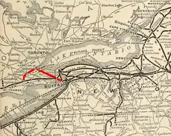 The railway was originally chartered in 1884 by the Ontario Legislative Assembly to run from Toronto to the International Railway Bridge, connecting with local lines to Buffalo. The original charter forbade the company any attempt to merge with, lease from, sell to, or pool with any other railway. Given the business conditions at the time, that turned out to be an impossible condition. The original corporation was unable to complete the line before the original charter expired and so the government revived the act by requiring the line to be completed by 1894 with a new group of promoters.