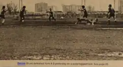 The Varsity mentions that, as early as 1880, the University College Associated Football Club competed against the Knox College, Collegiate Institute, and Medical School club teams.[5] By the following year, the team was practicing regularly and travelling as far as Berlin (Kitchener, ON) for a tournament. While these early teams appeared to have practiced regularly on Front Campus, an actual organized club would not be formed until the spring of 1884.