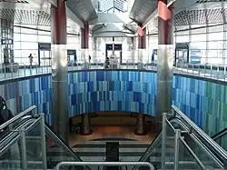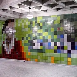 | Sliding Pi | Arlene Stamp | Large-scale mosaic along the curved wall of the stairway between the bus platform and the mezzanine |