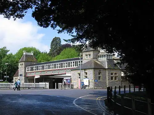 The station has two ranges of buildings, each 244 feet (74 m) long, built in local grey rubble stone on either platform. Deep canopies on composite iron and wood girders cover the platforms; there are further canopies on the road side of both buildings. the building which faces the sea at Abbey Sands and the town is used and this houses the ticket office and a café; the gate from this approach road is open when trains are running.[9] The one remaining signal box (now rented out for commercial purposes) is situated at the south end of this platform near a decorative cast iron bridge across the tracks. The station buildings are Grade II listed.[1]