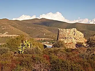 The Tower of Lozari (Corsican: Torra di Lozari) is a ruined Genoese tower located in the commune of Belgodère on the west coast of the French island of Corsica. Only the base of the tower has survived. It sits on the headland at a height of 32 metres (105 ft) overlooking the sea.