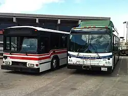 In 2010 Torrance Transit began replacing its bus fleet with a purchase of 10 gasoline-electric hybrid New Flyer (NFI) GE40LFRs; 20 compressed natural gas (CNG)-powered NFI C40LFRs were delivered in 2011, joined by 9 more CNG NFI XN40s in 2012.[6] The new buses were delivered with a new paint scheme which marked the start of a rebranding effort by the agency.[7][8]