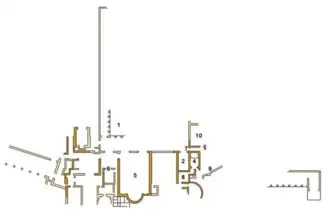 The nearby Roman Villa Sora[3] was a large and sumptuous residence with terraces down to the beach and overlooking the sea from its 150m-long frontage, dating from the 1st c. BC, whose excavated remains can be seen today.[4] It was built on multiple levels like the Villa of the Papyri and on the beach below are the remains of a Roman bath complex (Terme Ginnasi) and quays would have been on the shore.[5] It was embellished in the early imperial period and was being renovated in 79 AD, probably after the 62 AD earthquake as shown by the piles of lime in some rooms, unfinished precious opus sectile floors made of imported marble and a famous graffito which recorded the cost of the work.