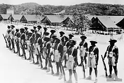 Due to the racial policies in place at the time, all officers and senior non-commissioned officers were white Australians, while the Torres Strait Islanders originally only received one third of the pay of white soldiers of equal rank.[5][8] In response to this and other concerns, 'A', 'B' and 'C' Companies of the battalion briefly went on strike in late December 1943.[3] In February 1944 the Army agreed to increase the soldiers' pay to two-thirds of that of white soldiers. The indigenous soldiers finally received full back pay for their war service in 1986.[5][8] Despite the discriminatory pay scales the Islanders generally appreciated the Army's culture, as its discipline and hierarchy allowed them to be treated with respect by white soldiers.[5]