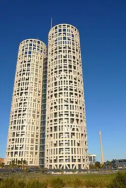The Torres de Hércules (English: Towers of Hercules) are office buildings in Polígono Industrial Las Marismas, Los Barrios in Province of Cádiz. The building is 100.6 m (330 ft) tall and was completed in October 2009. The telecommunications antenna on top is 26 m (85 ft) tall. Each of the towers is 20 m (66 ft) in diameter.[1] These towers were the tallest in Andalusia until Cajasol Tower was completed in Seville in 2015.[2]