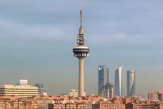 Torrespaña (lit. transl. Towerspain) is a 232 m (761.15 ft) high reinforced concrete freestanding broadcasting tower in Madrid, Spain. It is the central and main transmission node of the terrestrial television and radio networks in the country as well as the station that covers the city and its metropolitan area. National and regional television channels and radio stations broadcast from there. The tower, currently owned by Cellnex, is located in a depression at the Salamanca district near the M30 highway.