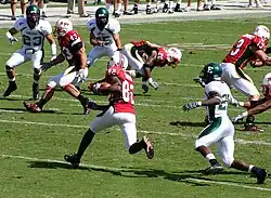In the 2008 Humanitarian Bowl, he returned a kickoff 99 yards for a touchdown against Nevada, which broke the bowl's previous return record of 98 yards.[23] It was also the first time a Maryland player returned a kickoff for a touchdown in a bowl game. At the end of the season, Smith had returned 42 kickoffs for 1,089 yards, which set a new Atlantic Coast Conference single-season record.[24] Smith led the team with 1,425 all-purpose yards, which put him ahead of starting running back Da'Rel Scott who compiled 1,304 yards.[11]