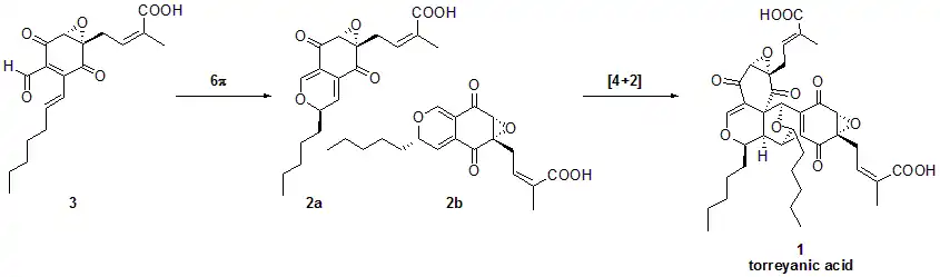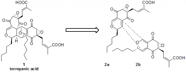 - ^ a b c d Li C, Johnson RP, Porco JA (April 2003). "Total synthesis of the quinone epoxide dimer (+)-torreyanic acid: application of a biomimetic oxidation/electrocyclization/Diels-Alder dimerization cascade". Journal of the American Chemical Society. 125 (17): 5095–106. doi:10.1021/ja021396c. PMID 12708860.