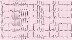 Torsades de pointes, torsade de pointes or torsades des pointes (TdP; also called torsades) (/tɔːrˌsɑːd də ˈpwæ̃t/,[2] French: [tɔʁsad də pwɛ̃t̪], translated as "twisting of peaks") is a specific type of abnormal heart rhythm that can lead to sudden cardiac death. It is a polymorphic ventricular tachycardia that exhibits distinct characteristics on the electrocardiogram (ECG). It was described by French physician François Dessertenne in 1966.[3] Prolongation of the QT interval can increase a person's risk of developing this abnormal heart rhythm, occurring in between 1% and 10% of patients who receive QT-prolonging antiarrhythmic drugs.[4]