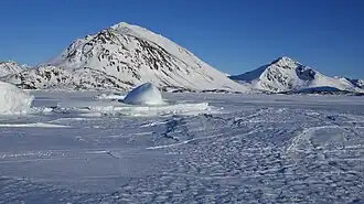During winter pack ice and small icebergs pushed forth by the East Greenland Current ram against the northeastern coast, blocking the narrow Ikaasaartik Strait and facilitating the freeze of the much wider Torsuut Tunoq sound. The tidewater Apusiaajik Glacier drains into the sound in its northernmost part.