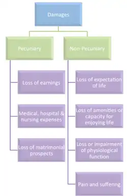 Indian jurisprudence identifies seven distinct categories of harm for which damages may be awarded in tort actions involving personal injuries. These categories are referred to as heads of claim and can be divided into pecuniary and non-pecuniary subsets, analogous to the more general distinction made between economic and non-economic damages in other common law jurisdictions. Indian tort law recognises the following pecuniary heads of claim:[79]