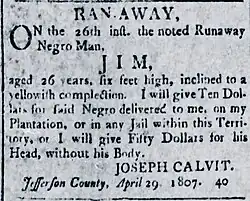- ^ "Fifty Dollars Ranaway or Stolen". Natchez Gazette. July 24, 1819. p. 4. Retrieved 2024-08-17.