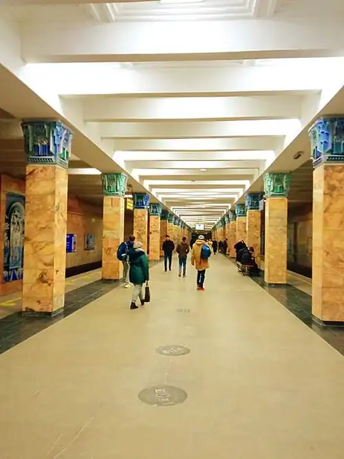 Toshkent is a station of the Tashkent Metro on Oʻzbekiston Line. The station was opened on 8 December 1984 as the eastern terminus of the inaugural section of the line, between Alisher Navoiy and Toshkent. On 6 November 1987 the line was extended to Chkalov.[1] It serves Tashkent's main-line railway station.