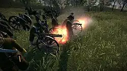 At the start of a campaign, the player is largely limited to recruiting traditional samurai warriors and levies reminiscent of Shogun 2, but through adopting modern technologies and military buildings can also recruit western-style units, such as rifle-armed line infantry and artillery—including both cannons and gatling guns, which largely render traditional units obsolete. Warships are now western-designed—equipped with steam engines and broadside cannons—and naval battles are fought more akin to those in Empire: Total War and Napoleon: Total War. Warships are additionally capable of attacking enemy armies and provinces on the campaign map (as well as providing fire support during battles), which can be countered by defenses in ports and increasing the level of castles in provinces. New to the Total War series is the ability to manually operate artillery units and warships in battles, where the player uses their mouse to aim and fire from a first-person perspective.