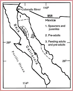 Totoaba are long-lived and may live up to 20-25 years, but sexual maturity is usually not reached until females are seven years old and males are six years old.[8] Female and male totoaba measured length during their first sexual maturity is between 1.3 and 1.2 metres (4 ft 3 in and 3 ft 11 in).[8] The totoaba's population growth is slow, with a minimum population doubling time of 4.5 to 15 years.[2] The totoaba spawn in the mouth of the Colorado River Delta, serving as a nursery of shallow, brackish waters for the young fish.[1][13] The totoaba population is found in two distinct groups. Larval and juvenile stages occupying the Colorado delta, while the adult breeding population lives for most of the year in deeper water towards the middle of the Gulf of California. The breeding timeframe starts in January and continues til May with a peak in March and April.[8][13] Totoaba are an iteroparous species with asynchronous ovarian dynamics suggesting they are batch spawners.[8] One-year-old totoabas are metabolically most efficient in brackish water of about 20 parts per thousand (ppt) salinity, a level that occurred naturally in the delta before the diversion of water from the river that occurred in the middle of the 20th century.[14]