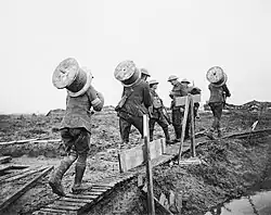 The division then spent a terrible winter, doing tours of duty in the Passchendaele Salient. While the infantry attempted to make small gains, the engineers constructed concrete dugouts, underground galleries and drainage systems. Important achievements were the construction of a double duckboard track (the 'Mule Track') as far into the salient as Tyne Cot, and a Decauville narrow-gauge railway as far as Crest Farm.[22]