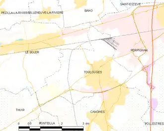 Toulouges is located between Thuir and Perpignan, in the canton of Perpignan-6 and in the arrondissement of Perpignan.