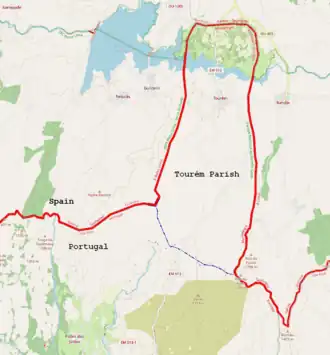 Tourém is a village and parish (freguesia) in the municipality of Montalegre in the far north of Portugal. The main part of the territory of the parish stretches as a small peninsula of Portuguese land within Spanish territory. The northern extremity of the parish is, in formal terms, a Portuguese exclave within Spain, being separated from the rest of the Parish, and the rest of Portugal, by a lake in the Salas River in Spanish territory. This is one of only two exclaves of Portugal. The parish has an area of 16,61 km² and 112 inhabitants (2021).[1]