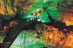 The Belum Caves in Nandyal District have a length of 3,229 metres (10,594 ft), making them the second largest natural caves on the Indian subcontinent. The Belum Caves derive their name from Bilum, the Sanskrit word for caves. The caves have long passages, spacious chambers, freshwater galleries, and siphons. The caves' deepest point is 120 feet (37 m) from the entrance and is known as Patalaganga.