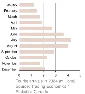 In 2023, non-Canadian visitors made 27.2 million trips to Canada, with U.S. residents contributing the most, accounting for 21.2 million of those trips. The total spending by tourists reached $12.9 billion for U.S. residents and $12.6 billion for overseas visitors.[2] Domestic and international tourism combined directly contributes 1% of Canada's total GDP and supports 309,000 jobs in the country.[3]