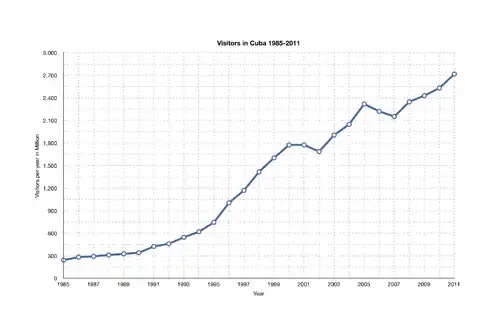 Cuba remains one of the few countries with an economy established by a centralized government. Among those countries, only Cuba possesses a large international tourism sector.[39] The fall of the USSR and the U.S. embargo imposed in 1961 affected Cuba's tourism sector. Cuba was dependent on the USSR and after its collapse saw tourism as an option to reduce the effects of the crisis. Cuba's touring numbers began to decrease during the 1960s through the 1980s due to the U.S. embargo during the Cold War. Additionally, almost 62,000 tourists traveled to Cuba in 1960, 4180 tourists in 1961, and then almost zero over the next 20 years.[40] Also, new hotels were built and old hotels were renovated to draw more international visitors.[41] When Raul Castro rose to power in 2008, he implemented infrastructure reform to help reduce the effects of the Cuban revolution. The Cuban government built beach resorts to further expand tourism. Castro's reform policies led to increased tourism and large economic success in Cuba. 2.7 million people visited Cuba in 2011, while only 340,000 people toured Cuba in 1990.[42] The National GDP increased from 30.69 billion in 2002 to 114.10 billion in 2010.[42] While infrastructure reform benefitted Cuba's GDP and tourism numbers, average spending decreased from $1,310 in 1995 to $876 in 2015. Furthermore, Cuba ranks one of the lowest for returns in the travel industry. Contributing to the low rank: low-quality food, poor customer service, and low affordability. These issues must be resolved to maintain Cuba's tourism economically in the long term.[42]