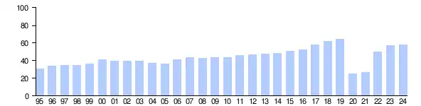 In Italy, there is a broad variety of hotels, going from 1-5 stars. According to ISTAT, in 2017, there were 32,988 hotels with 1,133,452 rooms and 2,239,446 beds.[24] As for non-hotel facilities (campsites, tourist villages, accommodations for rent, agritourism, etc.), in 2017 their number was 171,915 with 2,798,352 beds.[24] The tourist flow to coastal resorts is 53 percent; the best equipped cities are Grosseto for farmhouses (217), Vieste for campsites and tourist villages (84) and Cortina d'Ampezzo mountain huts (20).[25][26]