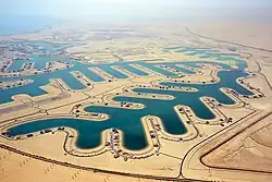 Sabah Al Ahmad Sea City is a city in Ahmadi, Kuwait built with canals forming 200 kilometres (120 mi) of artificial shoreline. The city houses up to 250,000 residents.[21][22] The city was inaugurated in mid 2016.[23][24] The artificial islands that make up the area are rather unusual due to them being built by excavating large channels in the deserted land rather than using reclaimed land. The Sea City is also to be found as similar to the Palm Jumeirah Islands, which are located in the city of Dubai. Mall and Marina also there in this place.