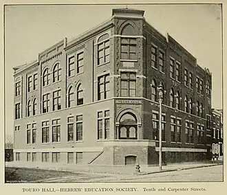The Hebrew Education Society opened Hebrew School No. 2 in 1878, and Philadelphia Jewish philanthropist David Sulzberger was a significant donor and led the construction of Touro Hall in 1891.[3] The Hebrew Education Society purchased the land at 10th and Carpenter in 1891 from Alexander Parker who had operated a botanical garden on the land. Construction began on April 11, 1891.[4]