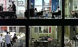 The factory set consists of a cross-sectioned building and allows the camera to dolly back and forth from room to room, theoretically through the walls. Another self-reflexive technique, this particular set was used because it forces the audience to remember that they are witnessing a film, breaking the fourth wall in a literal sense. Godard and Gorin use other self-reflexive techniques in Tout va bien such as direct camera address, long takes, and abandonment of the continuity editing system.