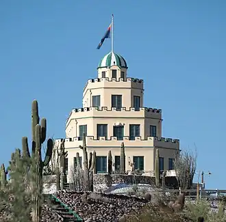 Tovrea Castle is a historic structure and landmark at 5041 East Van Buren Street in Phoenix, Arizona, on 44 acres (18 ha) bounded by the Red Mountain Freeway (State Route 202) to the east, Washington Street to the south, Van Buren Street to the north and the Main Post Office to the west. Locally known as the "Wedding Cake Castle," it was built from 1929 to 1931 in a vernacular Italianate Architectural Style by Alessio Carraro, and was originally intended as the hotel centerpiece of a planned destination resort. It became a private residence after its purchase in 1931 by E.A. and Della Tovrea.[1] The castle is now part of the Phoenix Parks System and is designated as one of the Phoenix Points of Pride. Plans were to fully open the site to the public in 2009, but cost overruns delayed the opening.[2] Currently the Castle and Grounds show over 5,000 individual cacti in over 100 different varieties, all maintained by Tovrea Carraro Society. The Society offers guided tours of the grounds, first floor, and basement along with special events as the Operator and Manager of the site.