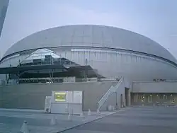 Construction was completed in early 1996. The primary architect was Mamoru Kawaguchi, founder of the firm Kawaguchi & Engineers.[1] The dome is composed largely of reinforced concrete and aluminum frames and covers an area of approximately 25,000 m2.[2] Inside is a main competition arena plus a separate swimming pool, training room, multipurpose hall, conference rooms and Restaurant Namihaya. The main arena has 6,000 fixed seats with a possible capacity for 10,000 people. There is a large screen display and a large electrical score screen.