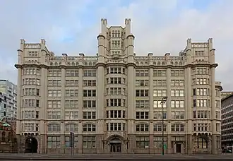 Tower Building is constructed on a steel frame. It is clad in grey granite, and faced with white glazed terracotta made by Doulton.[4] The Strand front has eight storeys and nine bays, the Water Street front has five storeys plus attics and three bays, and there is a curved bay on the corner. The bays are divided by polygonal turrets. On each end of the Strand front is a two-storey tower, and above the central bay rises a three-storey tower. A balustrade runs along the top of the building and around the two lateral towers.[2] At the corners of the towers are castellated turrets, which create a link with the former Tower of Liverpool.[1] Tower Building is recorded in the National Heritage List for England as a designated Grade II* listed building.[2]