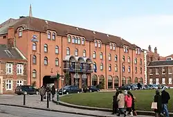 The street wraps around York Castle, with its various associated buildings and walls. Notable buildings on the other side of the road are the Hilton Hotel, built in 1986 as a Holiday Inn; the Tower Street drill hall, built in 1885 and now the York Army Museum; the mid-19th century 6 and 7 Tower Street, and 8 to 10B Tower Street; the early-19th century 11 and 12 Tower Street, and 13 and 14 Tower Street; and a memorial to the Boer War, in the middle of the street.[1][3] In 2021, the City of York Council began constructing a multi-storey car park to replace the former flat St George's Field Car Park, to permit the closure of the Castle Car Park.[4]