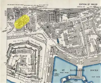 ![]() Tower of London station (disused) highlighted on an 1896 map | |