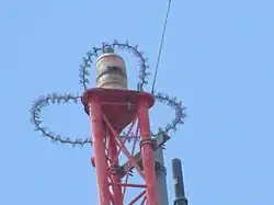 Since 1970 the roof has hosted a 30-meter-tall (98 ft) tapered steel mast, used as support for three FM antennas; 101.9 KQXT (then known as KCOR-FM), 102.7 KJXK (then KTFM), and 104.5 KZEP (then KITE-FM). In 2007, the three individual antennas were replaced by a 16-bay master antenna that radiates all three FM signals including the HD signal for KQXT. Clear Channel Radio and Electronics Research Inc. headed up the project along with their contractors and involved the City of San Antonio and Landry's Restaurants. The new antenna system improved coverage for all three radio stations. An option existed for several years to add facilities for a move in signal on 97.7 (requiring rearrangement of ten other stations) to share the site. This was organized by Bret Huggins and David Stewart of Rawhide Radio, LLC (partly owned by Hispanic Broadcasting, now Univision radio).