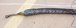 A towing sock or wire rope puller or wire pulling grip is a device that connects to the end of a cable, such as a power cable, in order to pull it through a tube or tunnel.[1] It works by tightening around the cable when pulled, in the same manner as a Chinese finger trap.[2] The towing sock is tubular and made of braided cable, open at one end and closed at the other where it connects to a tow line using an eye splice.[3]