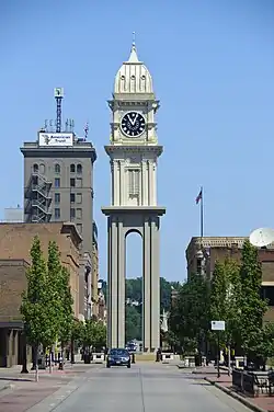 The Town Clock is a large clock that stands in downtown Dubuque, Iowa. The clock has stood over the city for over 140 years. The present clock is the second "Town Clock"; the first collapsed in the 1870s, killing three people. The building on which it originally stood is listed on the National Register of Historic Places, but the clock tower itself is not.[1]