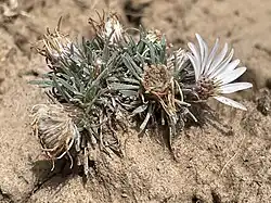 This is a petite perennial herb taking a clumped form just a few centimeters tall, its herbage growing on a caudex and taproot unit. The leaves are one to two centimeters long, linear or lance-shaped, and coated in rough hairs. The plant blooms in a profusion of flower heads each one to two centimeters wide with hairy to hairless, lance-shaped phyllaries. Each head contains many yellow disc florets and many white, pinkish, or blue ray florets each measuring roughly a centimeter in length. Occasionally, heads lack disc florets.[3] The fruit is a hairless achene tipped with a pappus of bristles.