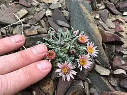 It is a small perennial herb taking a clumped form just a few centimeters tall, its herbage growing on a caudex and taproot unit. The leaves are up to 5 centimeters long and coated in rough hairs. The inflorescence bears flower heads on erect peduncles, each head measuring 1 to 3 centimeters wide with hairy phyllaries. Each head contains many yellow disc florets and many white, pinkish, or purplish ray florets each measuring up to 1.6 centimeters in length.