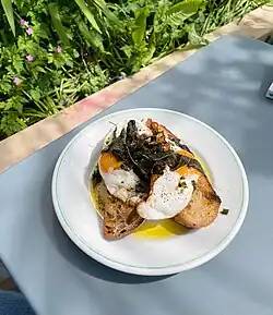 The cafe serves breakfast, brunch, lunch, and pastries. Their menu features Mediterranean and British-inspired dishes prepared using locally sourced, seasonal ingredients.[3][4]